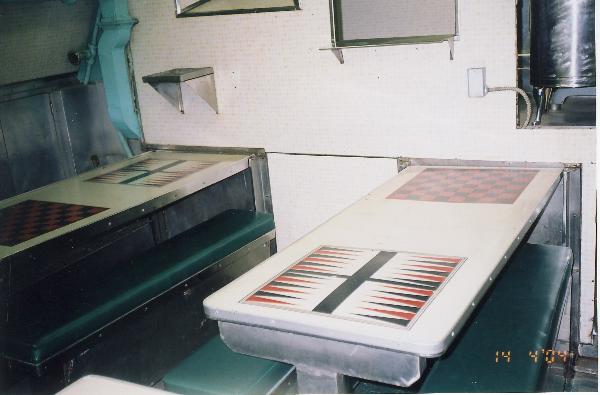 Between meals, the four tables in the submarine's galley area serve as game tables for acey-deucey, checkers, and chess. (This photo was taken inside the restored WWII submarine Cavalla (SS-244), on display at Seawolf Park, Galveston, Texas, in 2004.)