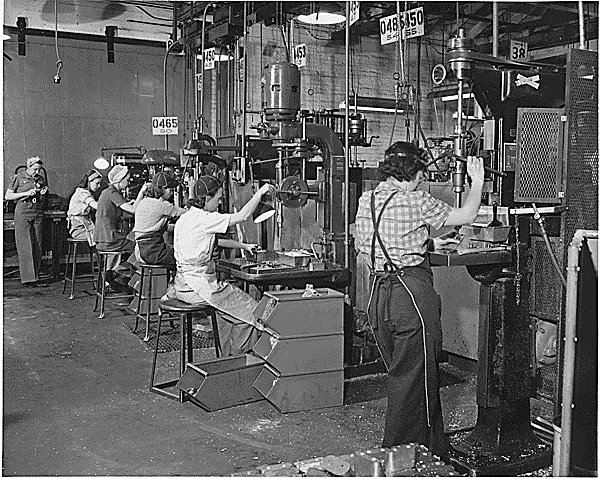 By the summer of 1942, most of the drill press operators in this American aircraft factory were women.