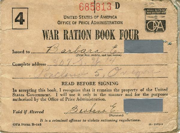 Front cover of a ration booklet (with last name redacted), typical of those issued to American civilians during World War