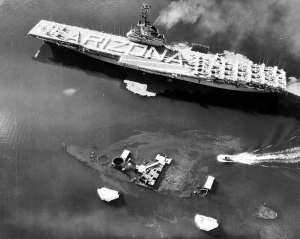 around the sunken hull is leaking from Arizona's fuel tanks.)