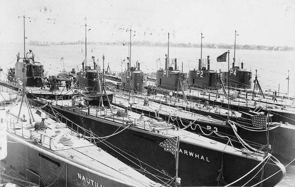 Dolphin was one of 27 submarines of varying lengths in the Pacific Fleet in 1941. The seven shown here are, from left, Nautilus (SS-168), Narwhal (SS-167), Shark (SS-174, marked P3), Dolphin (SS-169, marked D1), Porpoise (SS-172, marked P1), Pike (SS-173, marked P2), Tarpon (SS-175, marked P4).