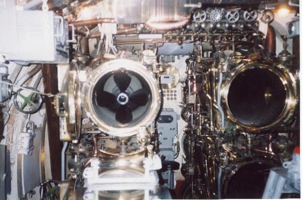 The torpedo tube at left is loaded and ready to fire. (This photo was taken inside the WWII-era submarine Bowfin (SS-287), on display at USS Bowfin Submarine Museum and Park, Pearl Harbor, Hawaii, in 2003.)
