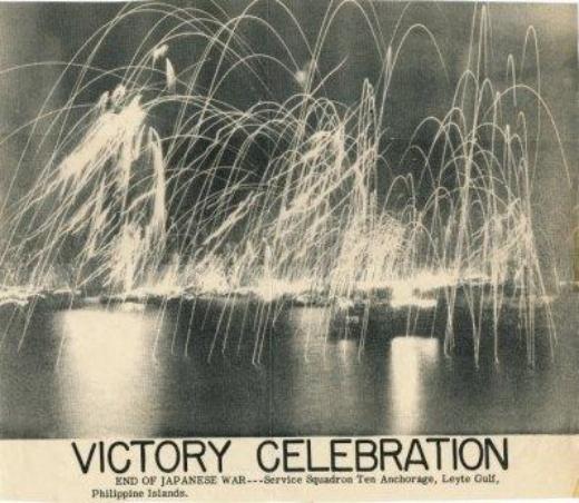 US Navy warships at anchor in the Philippines fire anti-aircraft guns in celebration of Japan's