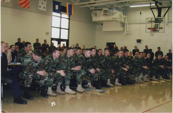 A standing-room only crowd on the drill deck of the Naval Operations Support Center attends the